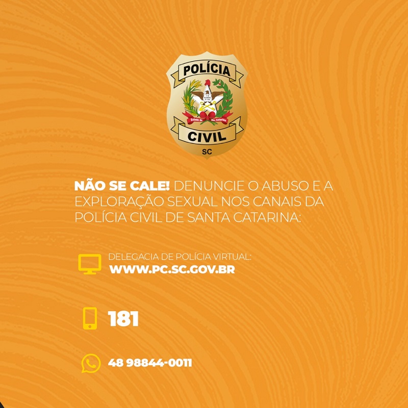 Nesta quarta-feira (18), dia Nacional de Combate ao Abuso e à Exploração Sexual de Crianças e Adolescentes, a Polícia Civil de Santa Catarina realiza uma série de ações que visam abordar o tema e a importância de denunciar os abusos e a exploração sexual (confira abaixo).