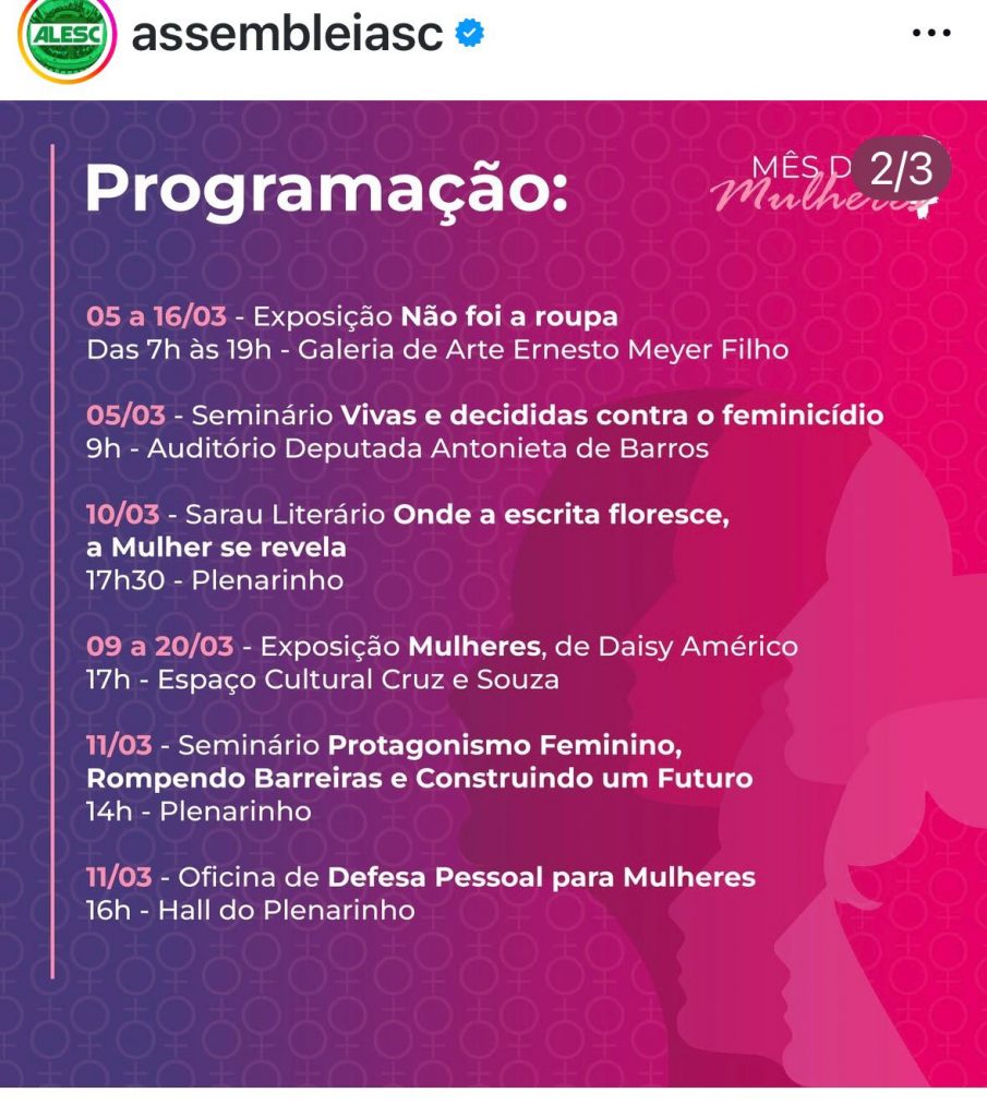 A Assembleia Legislativa de Santa Catarina (Alesc) realiza, ao longo do mês de março, uma programação especial em alusão ao Mês das Mulheres. As atividades incluem seminários, exposições, oficinas, fóruns e eventos culturais que buscam valorizar o protagonismo feminino, promover o debate sobre direitos das mulheres e fortalecer iniciativas de enfrentamento à violência de gênero.