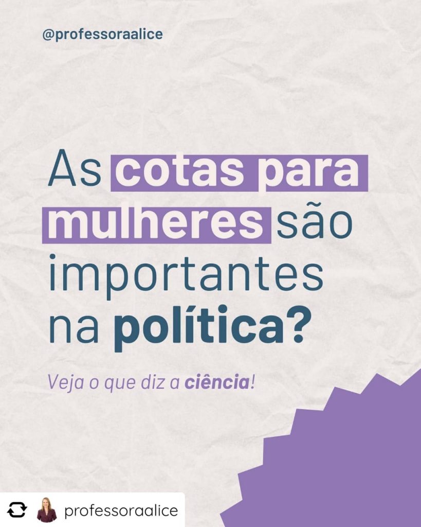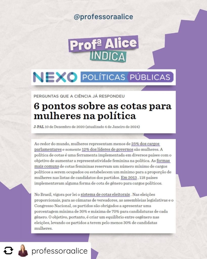 O portal Nexo publicou uma reportagem na qual discorre sobre seis pontos sobre as cotas para mulheres na política. ?? Assinado pelo Abdul Latif Jameel Poverty Action Lab (J-PAL), um centro de pesquisa internacional que trabalha para redução da pobreza a partir de estudos sobre políticas públicas, o texto foi divulgado em 2020, mas atualizado em janeiro deste ano.
