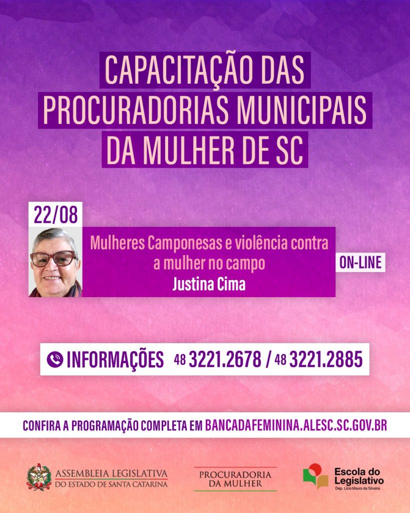 A Assembleia Legislativa de Santa Catarina, por meio da Procuradoria da Mulher e da Escola do Legislativo, convida para mais uma etapa do Curso de Capacitação das Procuradorias Municipais da Mulher de SC.