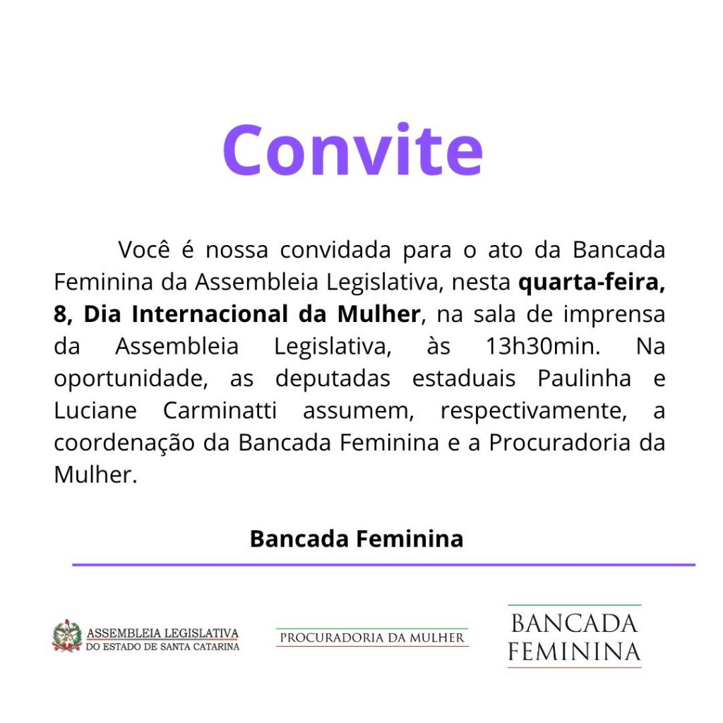 Convite para o ato de posse da Bancada Feminina e Procuradoria Especial da Mulher