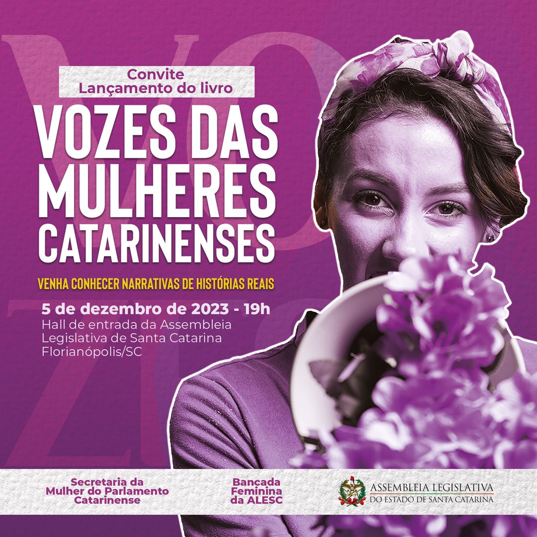 A Secretaria da Mulher da Assembléia Legislativa do Estado de Santa Catarina, convida para o lançamento do livro “Vozes das Mulheres Catarinenses – Narrativas de Histórias Reais”, a realizar-se no dia 05 de dezembro de 2023, às 19h, no Hall de entrada do Palácio Barriga Verde.