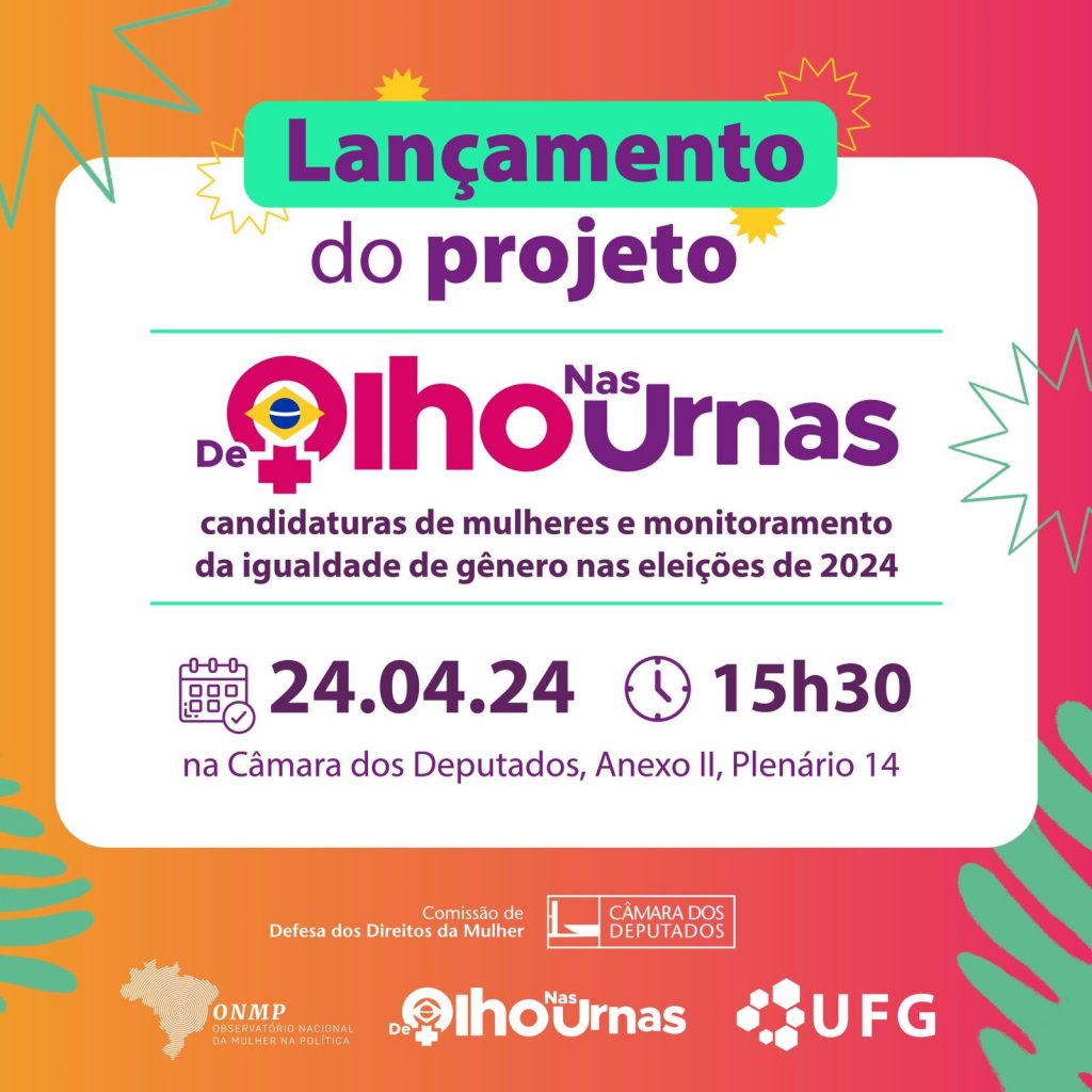 Foi lançado hoje, 24/4, os primeiros produtos do projeto de pesquisa da Universidade Federal de Goiás “De olho nas urnas”. O lançamento foi na Câmara dos Deputados em parceria com a Secretaria da Mulher e diversas outras instituições públicas de ensino. Apoiado pelo Observatório Nacional da Mulher na Política, o projeto tem como foco a investigação, a divulgação científica e a promoção da participação feminina nas eleições municipais de 2024. O projeto foi financiado pela Comissão de Defesa dos Direitos da Mulher da Câmara dos Deputados, e é coordenado pela reitora da UFG, Angelita Pereira de Lima. A Comissão de Defesa dos Direitos da Mulher e a Secretaria da Mulher, em parceria, realizam o lançamento do site e de uma cartilha do projeto, da Universidade Federal de Goiás, com informações que auxiliarão pré-candidatas às eleições a chegarem mais preparadas às urnas. Confira deolhonasurnas.ufg.br