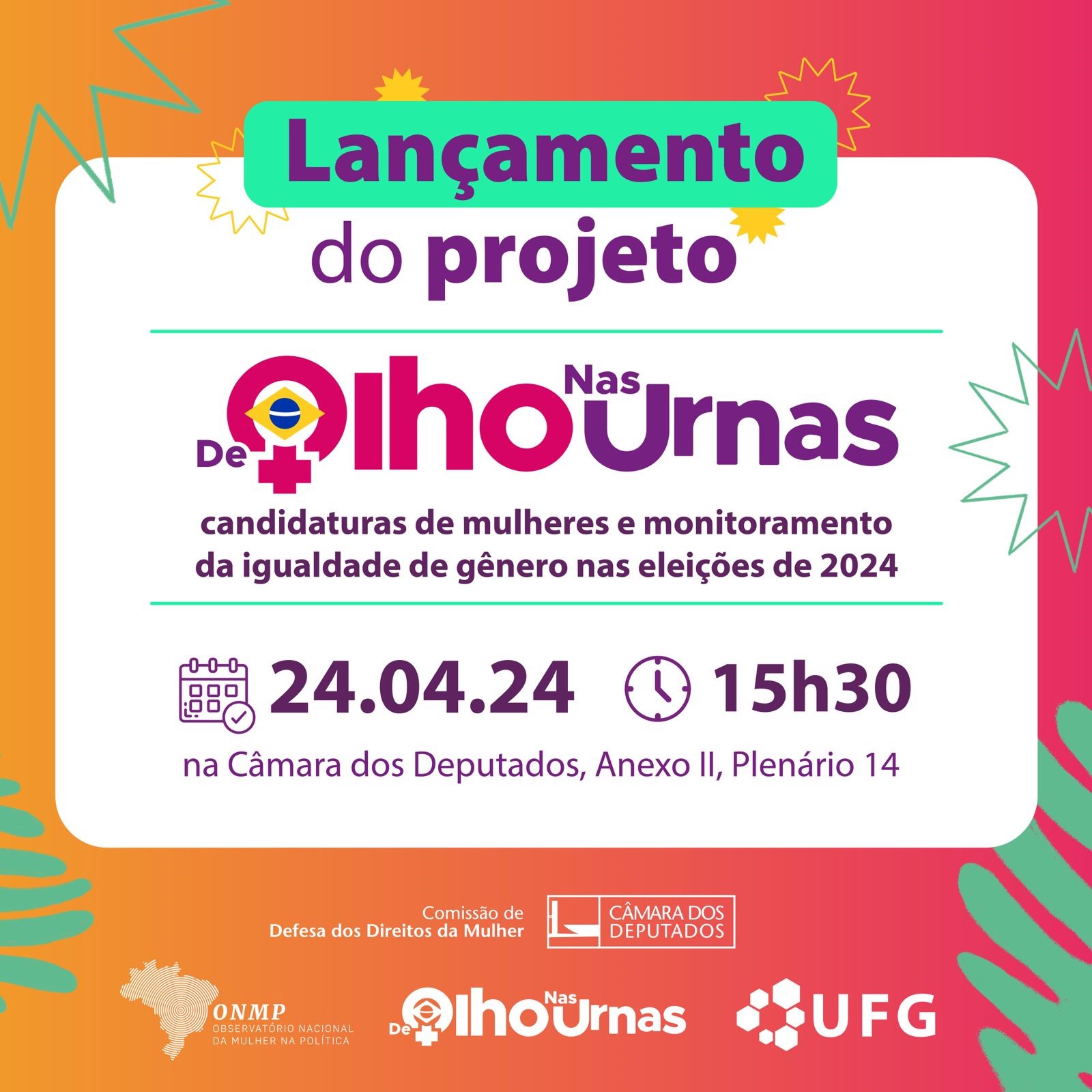 Foi lançado hoje, 24/4, os primeiros produtos do projeto de pesquisa da Universidade Federal de Goiás “De olho nas urnas”. O lançamento foi na Câmara dos Deputados em parceria com a Secretaria da Mulher e diversas outras instituições públicas de ensino. Apoiado pelo Observatório Nacional da Mulher na Política, o projeto tem como foco a investigação, a divulgação científica e a promoção da participação feminina nas eleições municipais de 2024. O projeto foi financiado pela Comissão de Defesa dos Direitos da Mulher da Câmara dos Deputados, e é coordenado pela reitora da UFG, Angelita Pereira de Lima. A Comissão de Defesa dos Direitos da Mulher e a Secretaria da Mulher, em parceria, realizam o lançamento do site e de uma cartilha do projeto, da Universidade Federal de Goiás, com informações que auxiliarão pré-candidatas às eleições a chegarem mais preparadas às urnas. Confira deolhonasurnas.ufg.br