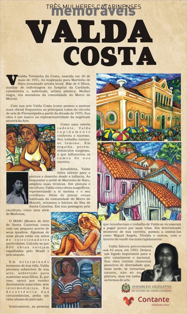 Valda Costa (1951-1993), artista plástica autodidata de grande relevância para Santa Catarina, cuja obra é um marco na representatividade da negritude através da arte. As temáticas de suas pinturas giram em torno da retratam a si mesma e o seu cotidiano, com cenas habituais da comunidade do Morro do Mocotó, onde residia, e também o folclore da Ilha de Santa Catarina. Hoje o Museu de Arte de Santa Catarina (Masc) conta com alguns de seus quadros no acervo. Ela foi também mãe de seis filhos, auxiliar de enfermagem no Hospital da Caridade e cabeleireira.