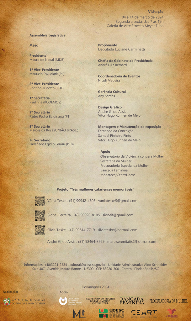 O trabalho consiste em apresentar a história de vida e a contribuição das três homenageadas para o estado, além de trazer elementos que retratam o contexto da época em que atuaram. Segundo a deputada Luciane Carminatti (PT), que propôs a exposição, “essas três mulheres têm trajetórias, histórias, vidas, experiências, têm ousadia, coragem e protagonismo.”