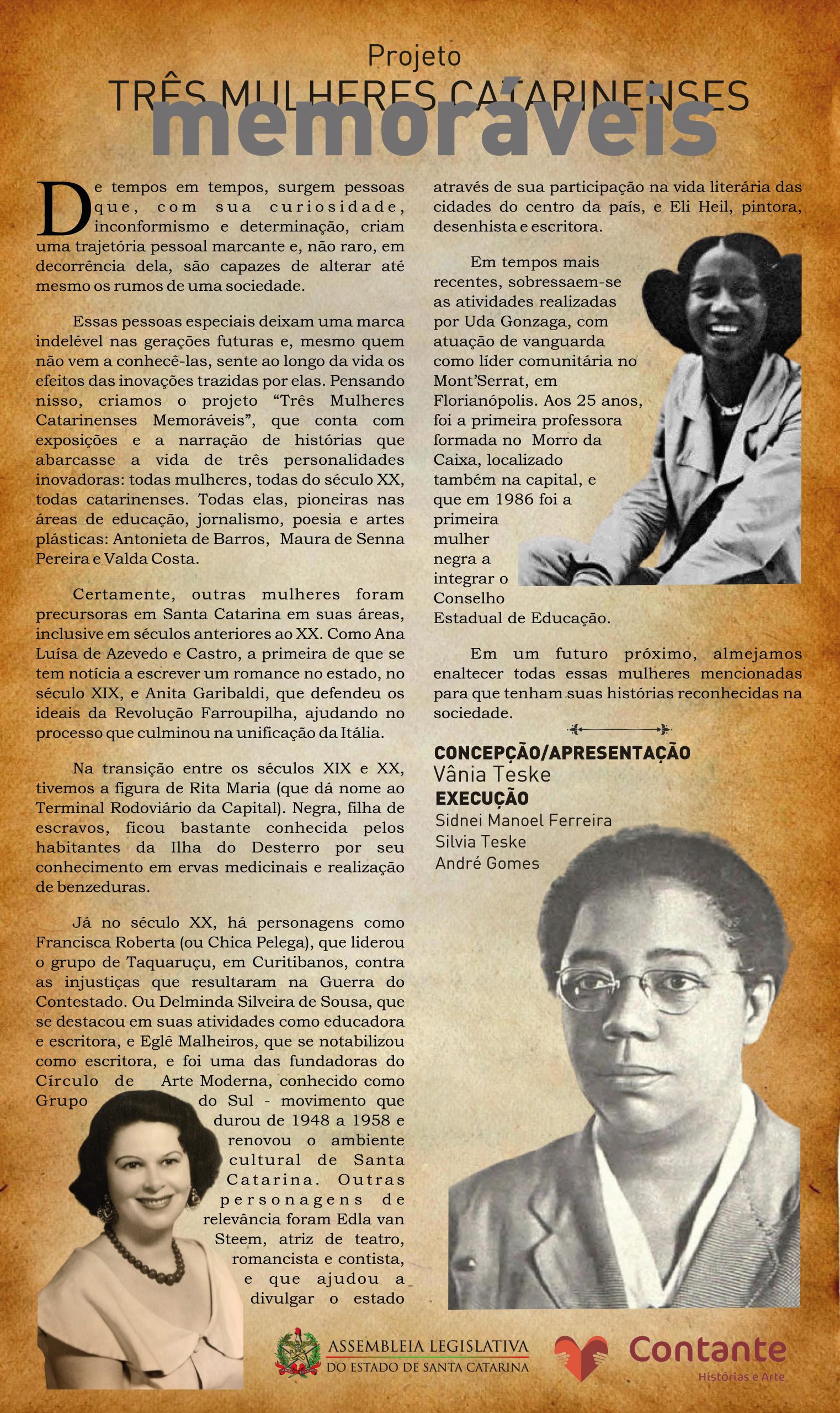 O evento de abertura também teve contação de histórias. Vânia Teske narrou passagens da vida das três catarinenses memoráveis. Ela, que também é uma das organizadoras da exposição, ressalta que “a história precisa sempre ser lembrada. São mulheres realmente pioneiras. Antonieta de Barros foi uma das primeiras jornalistas, a Maura de Senna Pereira também. A Valda Costa, com toda a condição que ela tinha, conseguiu circular nas altas rodas das artes visuais, é um fato inédito. Então a importância é fazer com que essas mulheres não sejam esquecidas.”