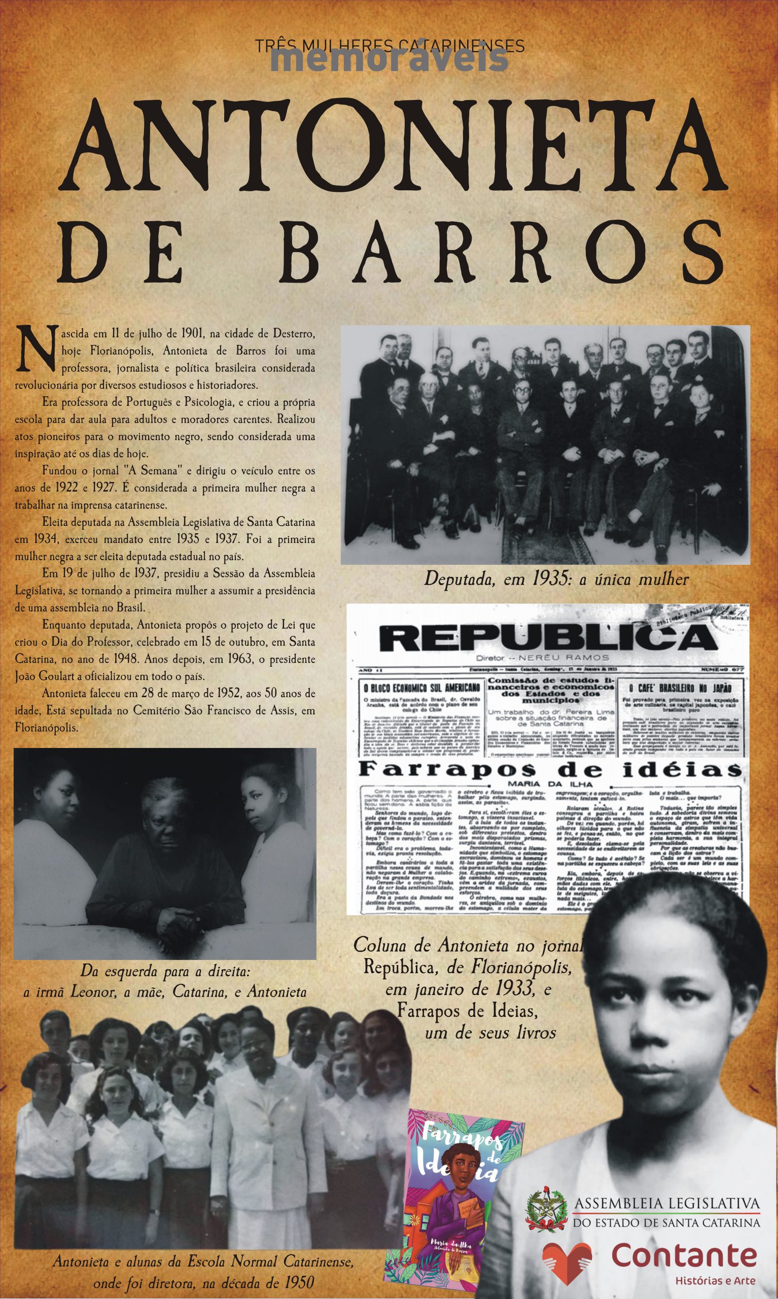Antonieta de Barros (1901-1952) é considerada revolucionária por diversos estudiosos e historiadores. Foi professora, jornalista e deputada na Assembleia Legislativa de Santa Catarina entre 1935 e 1937, sendo a primeira mulher negra a ser eleita deputada estadual em todo o país. Enquanto deputada, propôs o projeto de lei que criou o Dia do Professor. Além disso, fundou e dirigiu o jornal “A Semana”, sendo considerada a primeira mulher negra a trabalhar na imprensa catarinense.