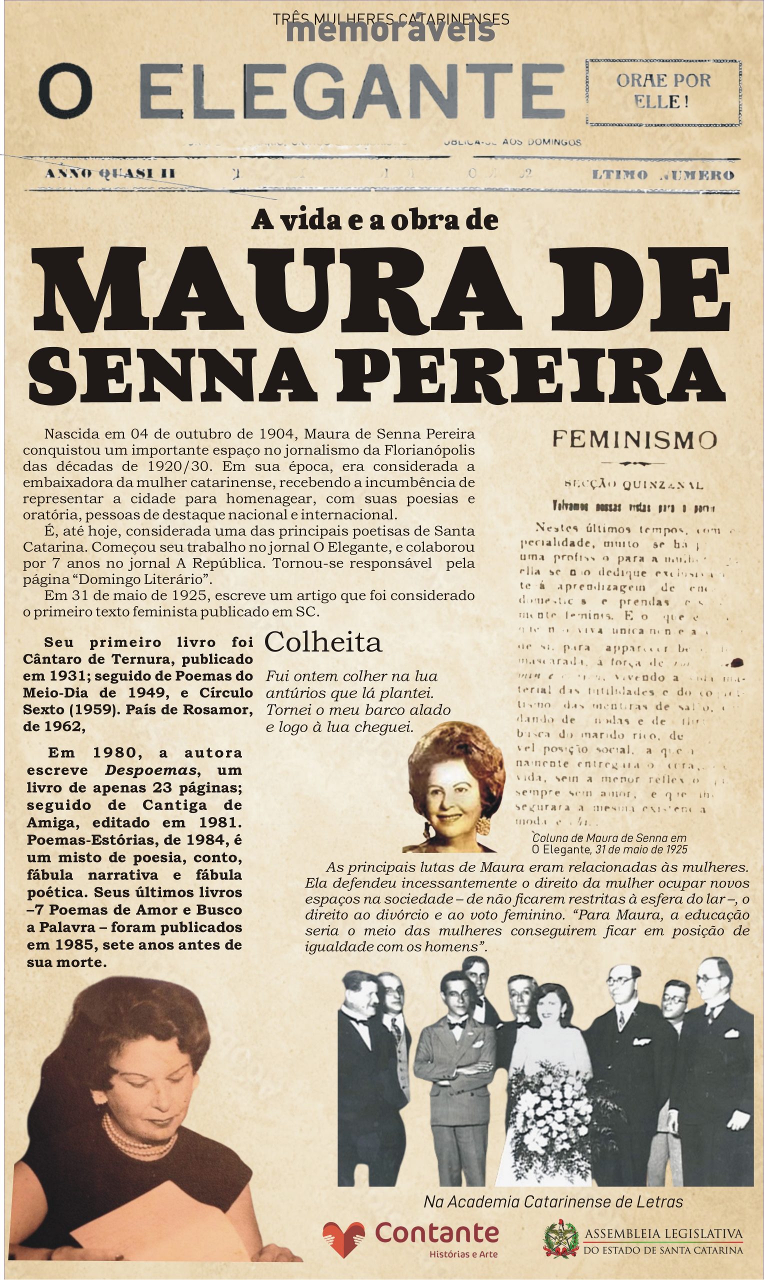 Maura de Senna Pereira (1904-1991) é uma das principais poetisas de Santa Catarina. Nas décadas de 1920 e 1930 era considerada a embaixadora da mulher catarinense, com o papel de representar Florianópolis e homenagear, com suas poesias e oratória, pessoas de destaque nacional e internacional. Em 11 de março de 1925, escreveu um artigo que foi considerado o primeiro texto feminista publicado no estado.