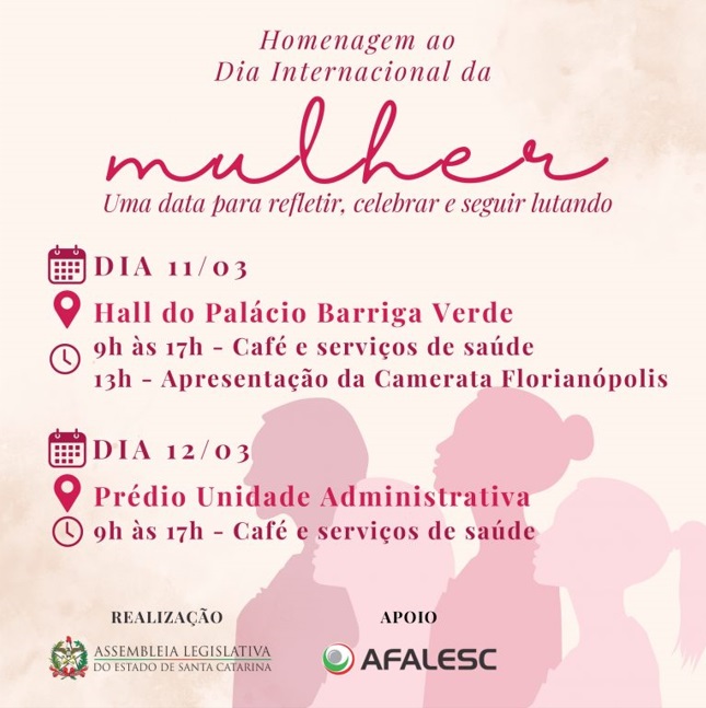A Assembleia Legislativa de Santa Catarina convida para a Homenagem ao Dia Internacional da Mulher, um momento de reconhecimento e celebração da força e trajetória das mulheres.