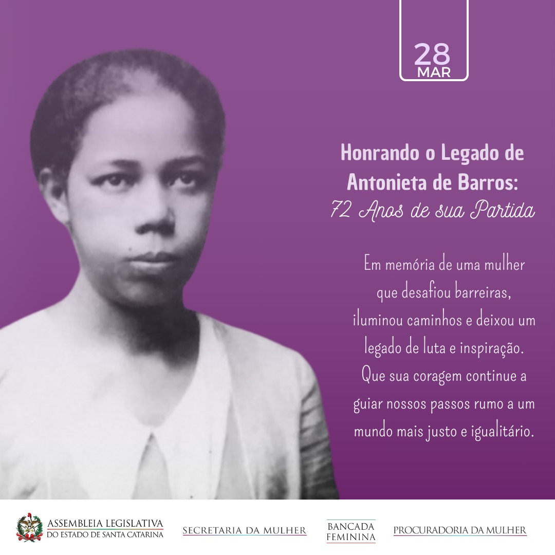 Hoje, celebramos e honramos os 72 anos desde que nos despedimos de uma figura notável em nossa história, Antonieta de Barros. Sua partida deixou um vazio que jamais poderá ser preenchido, mas seu legado de coragem, determinação e dedicação à justiça social continua a inspirar e guiar nossos passos.