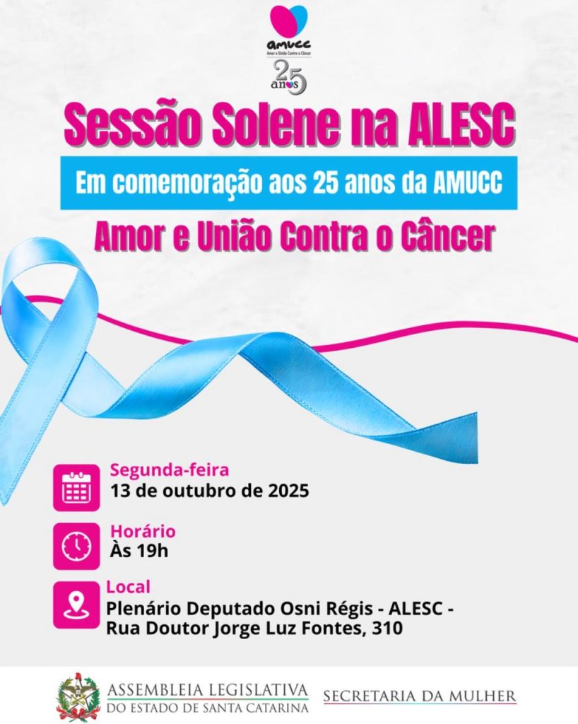 Em comemoração aos 25 anos da AMUCC – Amor e União Contra o Câncer, a Assembleia Legislativa do Estado de Santa Catarina realiza, na próxima segunda-feira, 13 de outubro de 2025, uma Sessão Solene em reconhecimento à trajetória e à contribuição da entidade na luta contra o câncer.